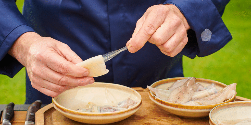 U međuvremenu, odvojite pipke od tijela (cijevi) evropskih lignji i uklonite želudac i kesicu sa tintom sa pipaka. Izvadite kost (oslik) iz tijela i odsijecite peraja. Zadnjom stranom noža istisnite želatinastu masu iz cijevi. Prepolovite limun i iscijedite sok. Dobro isperite tijela i pipke lignje u hladnoj vodi sa limunovim sokom.