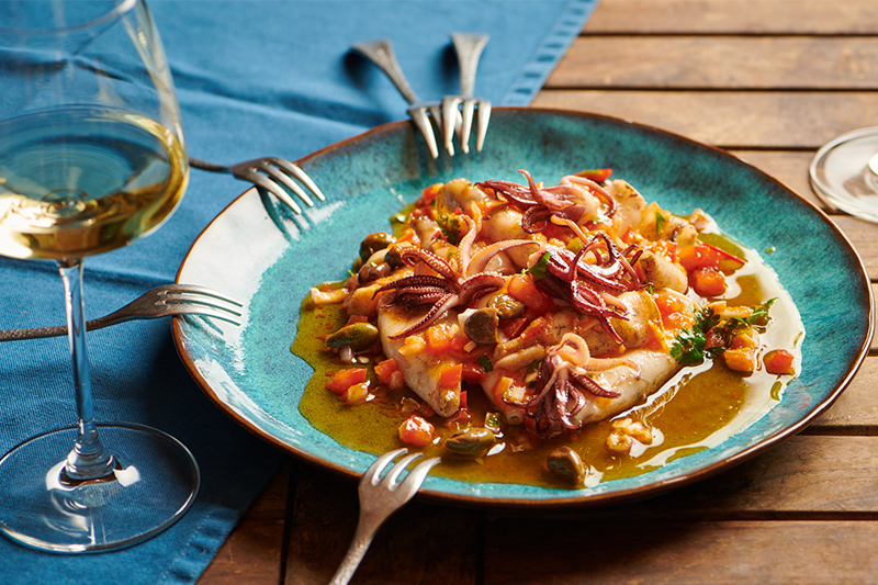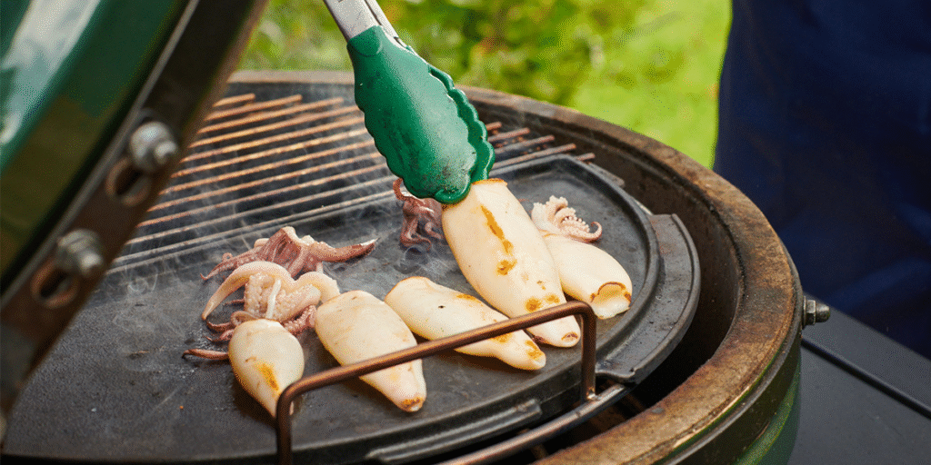 U međuvremenu, ocijedite lignje i posušite ih kuhinjskim papirom. Prelijte maslinovim uljem i dobro ih premažite. Posolite i pobiberite po ukusu.